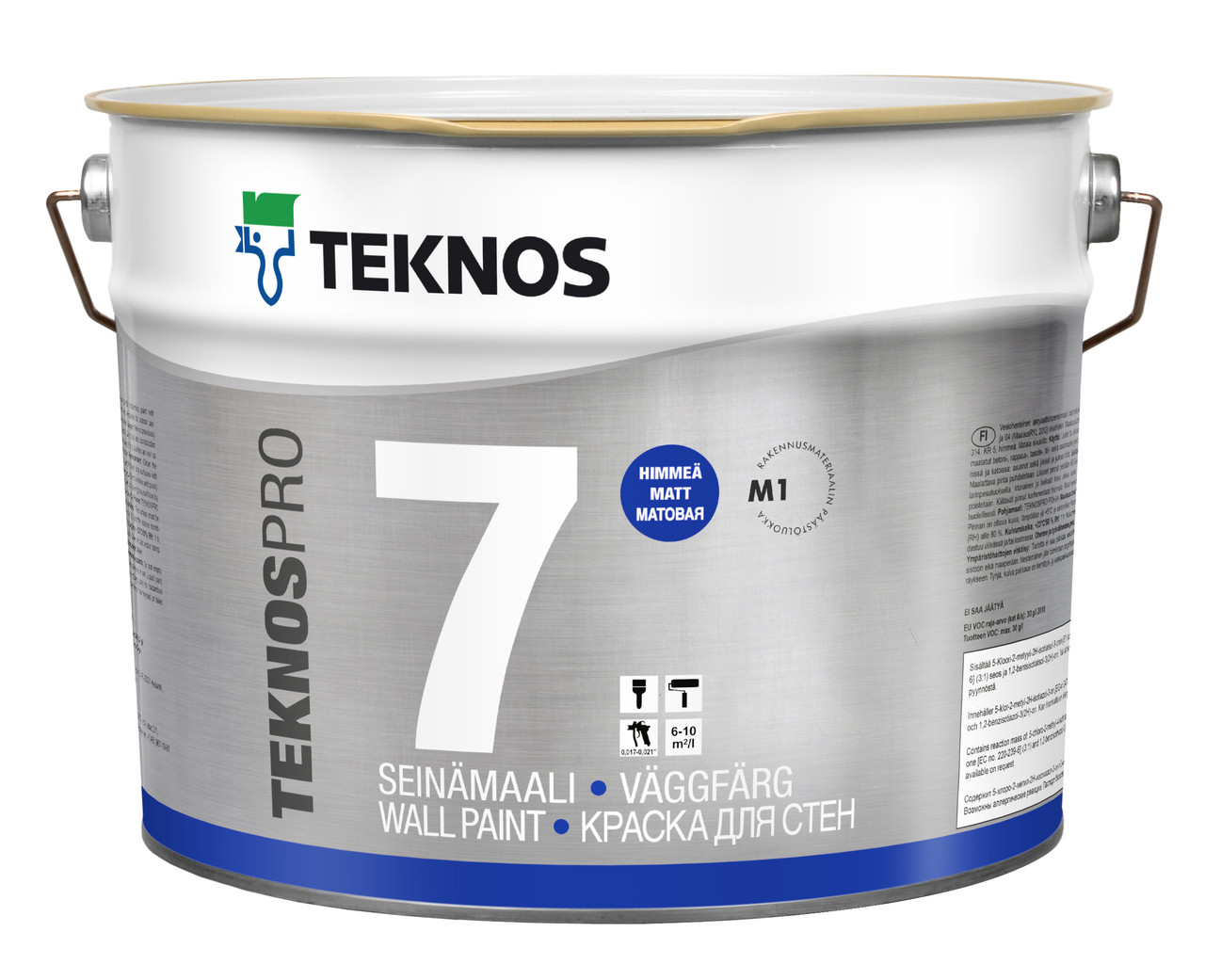 Акрилатна дисперсійна фарба для сухих внутрішніх приміщень. Має матовий блиск, а під боковим освітленням - незначний блиск.Ця фарба використовується для внутрішніх стін і стель, наприклад у квартирах і офісах. Вона легко наноситься та утворює гладку матову поверхню з привабливим зовнішнім виглядом. Фарбу TEKNOSPRO 7 можна наносити на бетонні, поштукатурені, зашпакльовані та цегляні поверхні, а також на різні будівельні плити. Її також можна використовувати для повторного фарбування поверхонь, що раніше фарбувалися алкідними й дисперсійними фарбами.